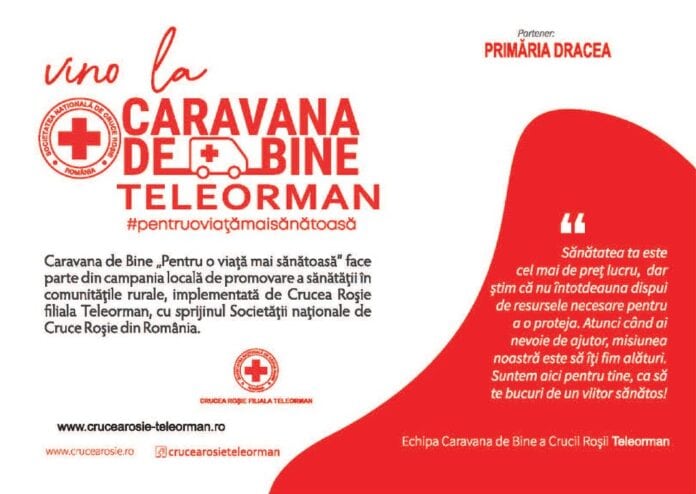 Sâmbătă, 3 august, Caravana de Bine “Pentru o viață mai sănătoasă” a Crucii Roșii filiala Teleorman se va afla în localitatea Dracea, la Sala de sport din localitate.