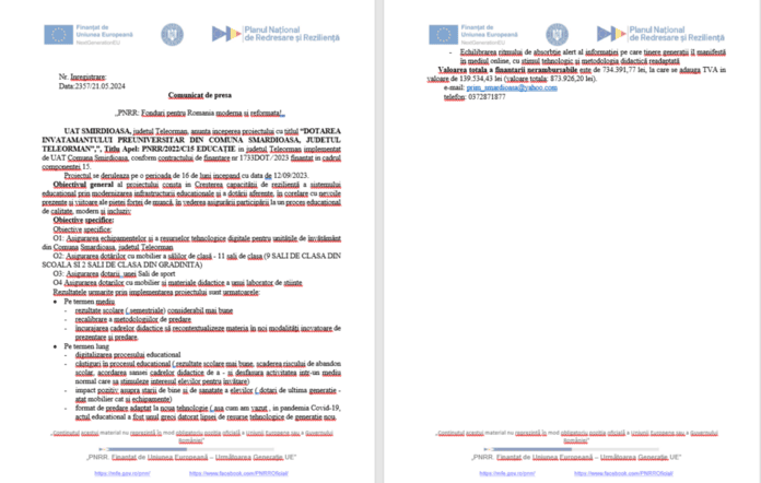 Comunicat de presă/ “DOTAREA INVATAMANTULUI PREUNIVERSITAR DIN COMUNA SMARDIOASA, JUDETUL TELEORMAN”