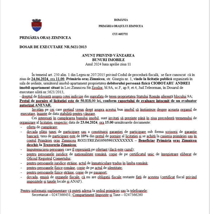 Primăria orașului Zimnicea anunță scoaterea la licitație a două bunuri imobile
