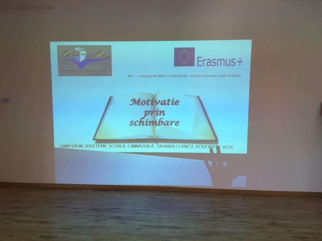 După terminarea cursurilor pe data de 12 iunie 2017, la Școala Gimnaială „Zaharia Stancu” din Roșiorii de Vede, în cadrul proiectului „MOTIVAȚIE PRIN SCHIMBARE”, s-a desfășurat simpozionul județean „Creativitatea în predare și instruire pentru un comportament școlar mai bun” și concursul decreație „Motivatie pentru învatare prin joc”. Au fost prezenți 150 de participanți care și-au susținut lucrările, respectând temapropusă. Simpozionul a fost deschis cu prezentarea proiectului, a scopului, și obiectivelor. Participantii la fluxuri au prezentat câte un material/model de bună practică însușite la cursulde formare. Toate lucrările prezentate în cadrul simpozionului se vor regăsi în ghidul de bunepractici „Motivație prin schimbare”, publicație ISSN.