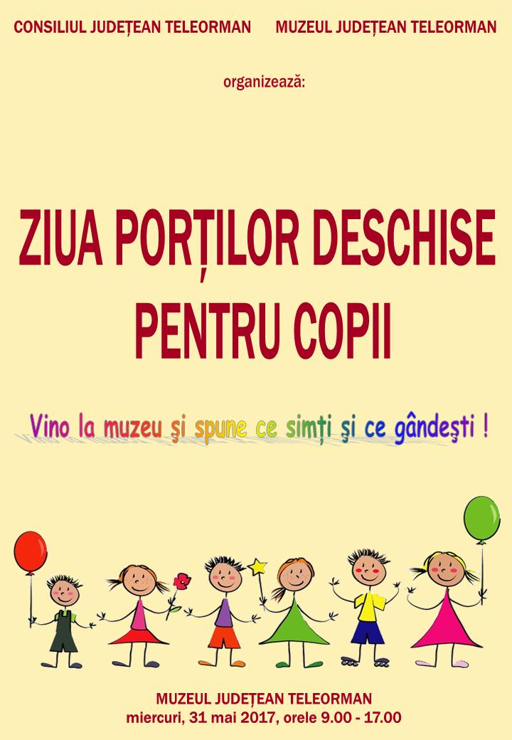 Potrivit unui comunicat de presă, cu ocazia Zilei Internaţionale a Copilului, Muzeul Judeţean Teleorman, instituţie de cultură aflată în subordinea Consiliului Judeţean Teleorman, organizează manifestarea „Ziua Porţilor Deschise pentru copii”.”